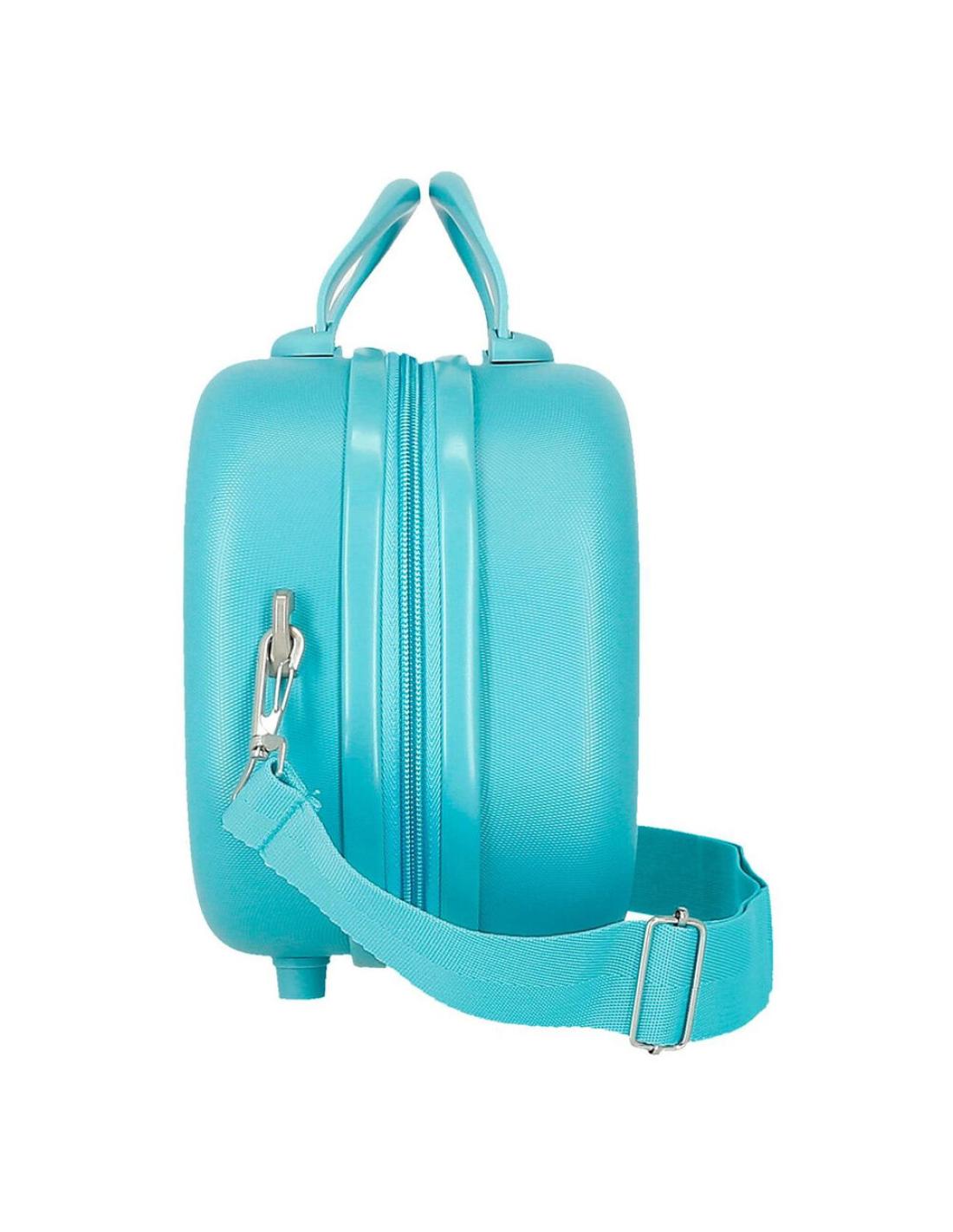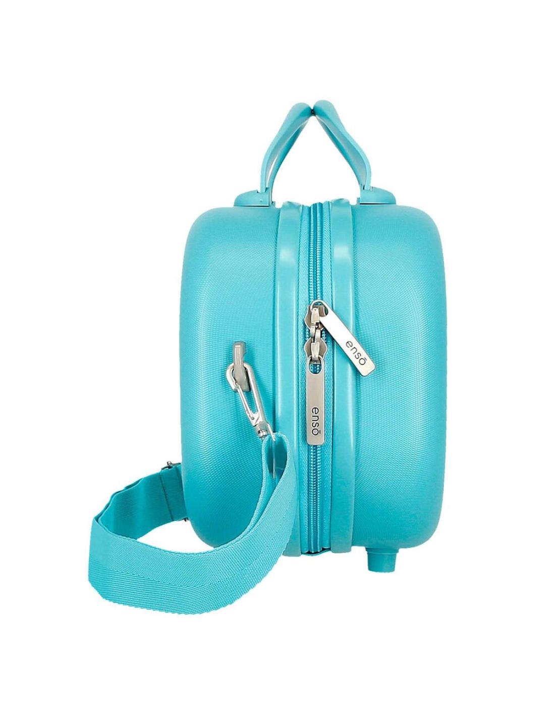 Neceser rigido de material ABS, con correa adaptable y banda elastica para adaptarlo a la maleta trolley.